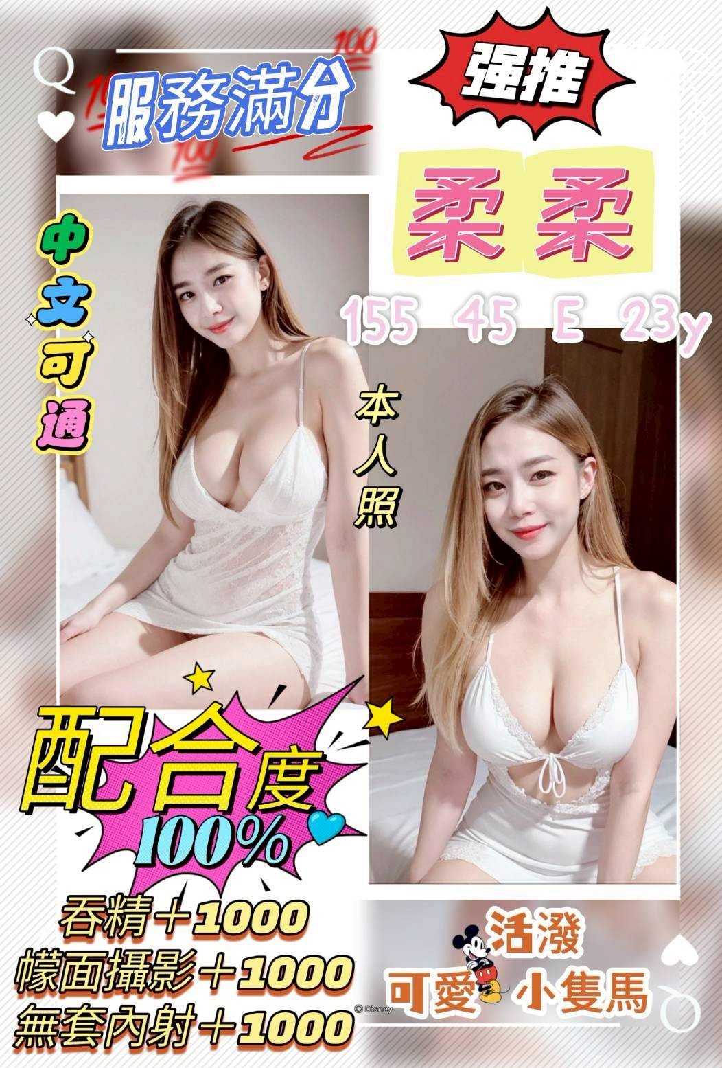 無套吹/戴套做/小親親/熱情舌吻/69/奶炮/胸推/屁推/共浴/按摩